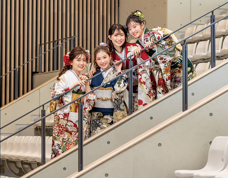 稲敷市では、参加者は1階フロア、保護者や一般の方は2階観覧席から見守る形式となっています。そのため、式典中の様子を上方向から写真や動画で撮影される可能性があります。立ち上がる、着席するといった動作の際は、すぐに動き出さず一拍おいてから動作を始めることで、立ち座りの途中姿が写りにくくなり、写真や動画でも落ち着いた所作として残りやすくなります。特に着席時は、裾を軽く前に逃がしてから腰を下ろすと、振袖のラインが整った状態で映りやすく安心です。